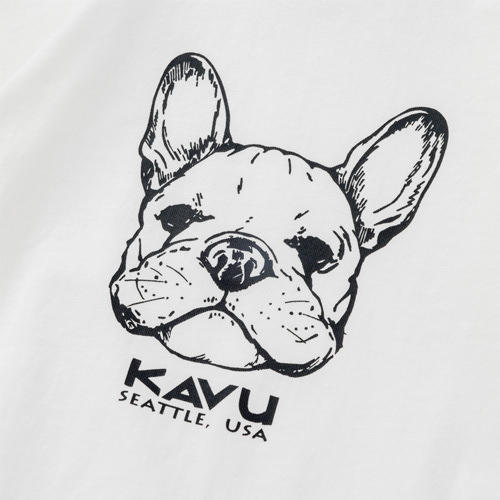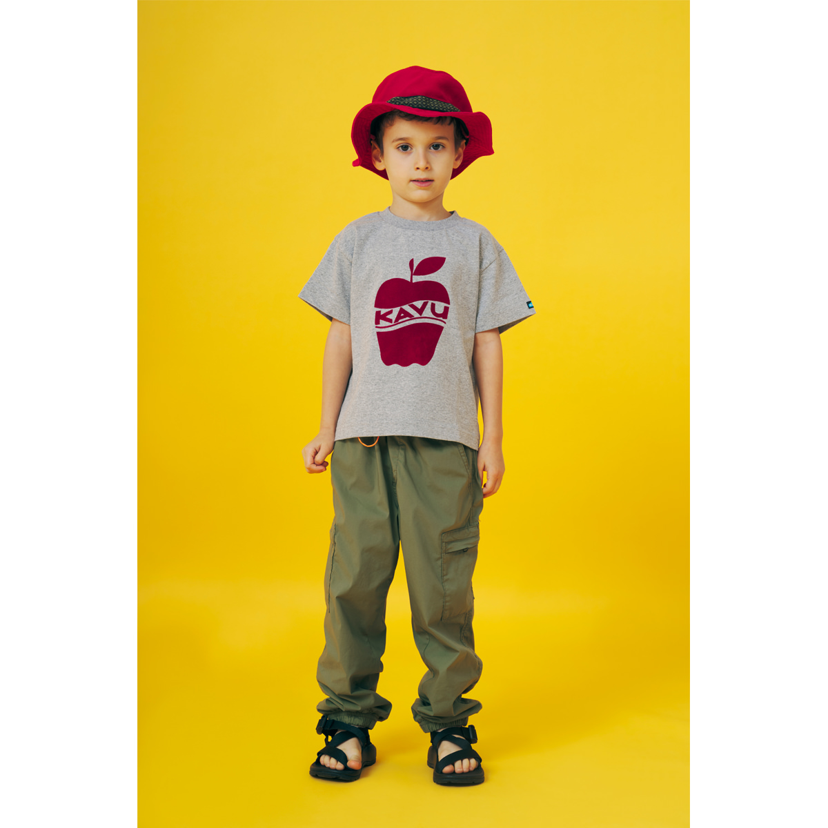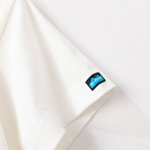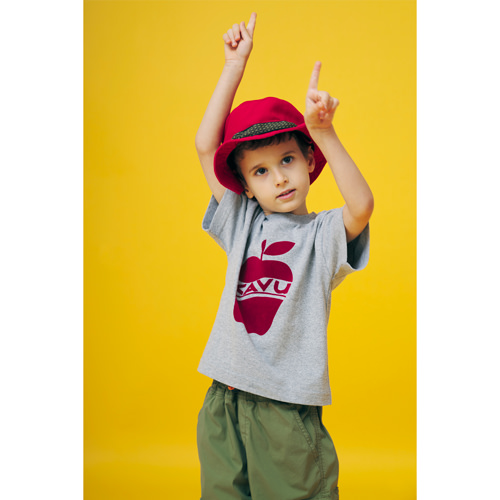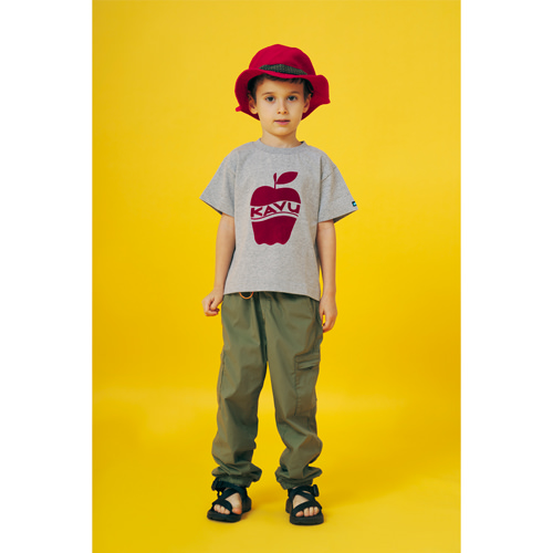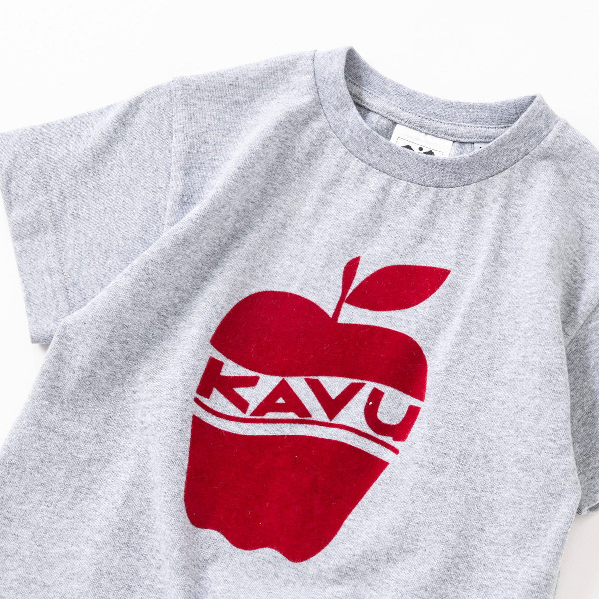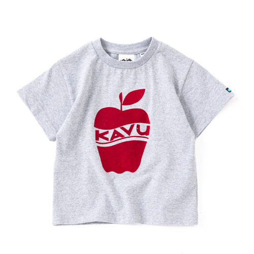 KAVUキッズのために、オトナとおそろいのTEEをご用意しました。おそろいを着て、さてどこに出掛けましょう!フロントにアップルがプリントされたTシャツにはベロア調のフロッキープリントを採用して、少しもこもこで立体的なプリントになっています。