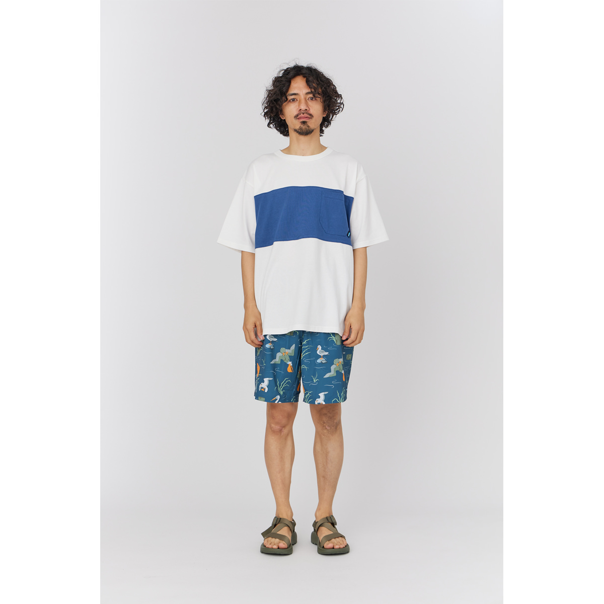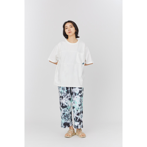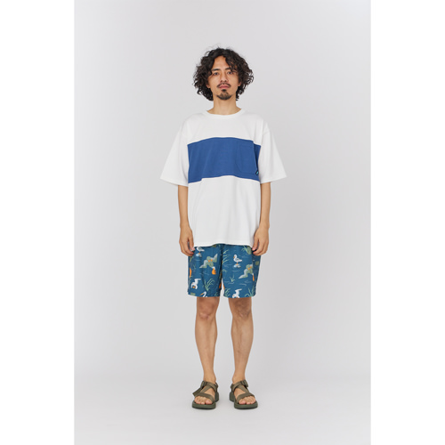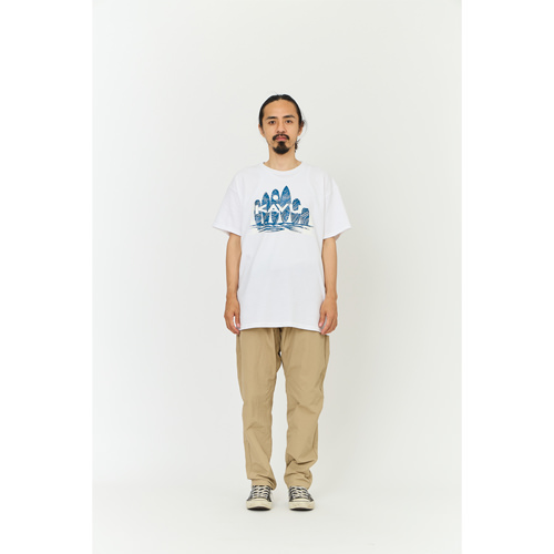 毎シーズン展開しているハンドプリントのシリーズですが、国内で1点1点手刷りで作成されています。 プリントに使用するインクもUSAから取り寄せたものを使用しています。 サーフボードをモチーフにした異なる2つのデザインが重なり合ってプリントされています。