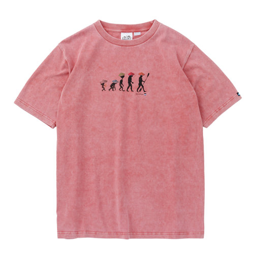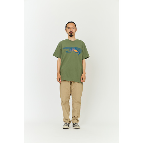 毎シーズン展開しているハンドプリントのシリーズですが、国内で1点1点手刷りで作成されています。 プリントに使用するインクもUSAから取り寄せたものを使用しています。 サーモンが2版でプリントされたT-shirtsです。